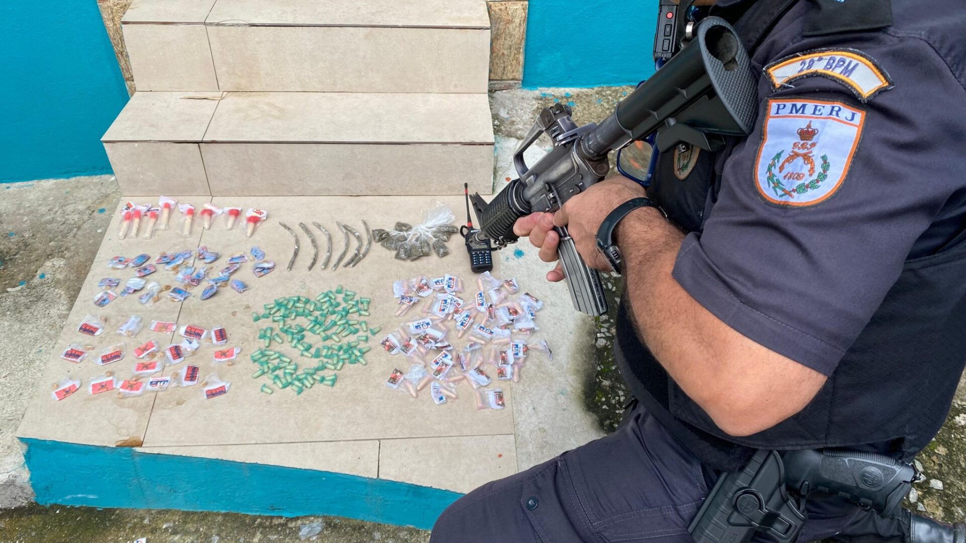 Chegando, os agentes avistaram os traficantes numa área de mata e acabaram fugindo com a chegada das viaturas da Polícia Militar. Porém, eles deixaram pra trás 156 pinos de cocaína, 41 pedras de crack e 17 tiras de maconha, além de um rádio de comunicação.