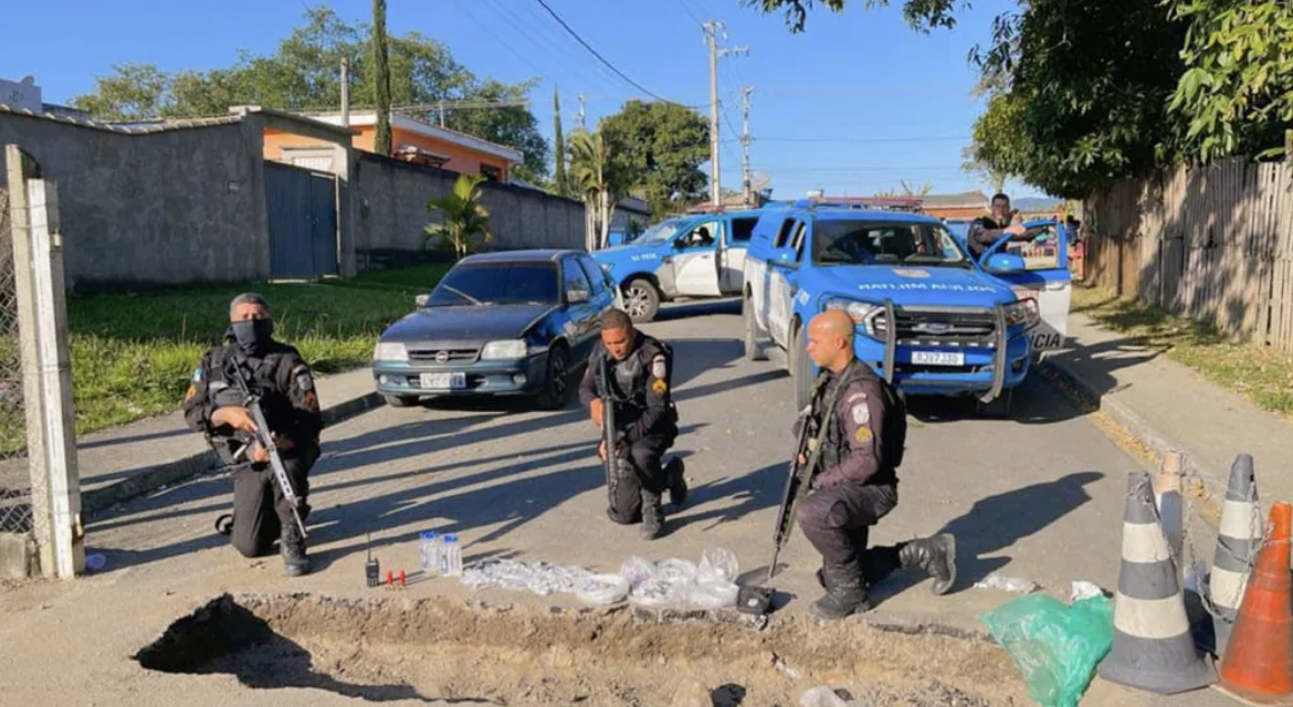 Quando chegaram lá, os criminosos estavam montando uma barreira para dificultar o acesso das viaturas e chegaram a abrir um buraco em uma das entradas do bairro.