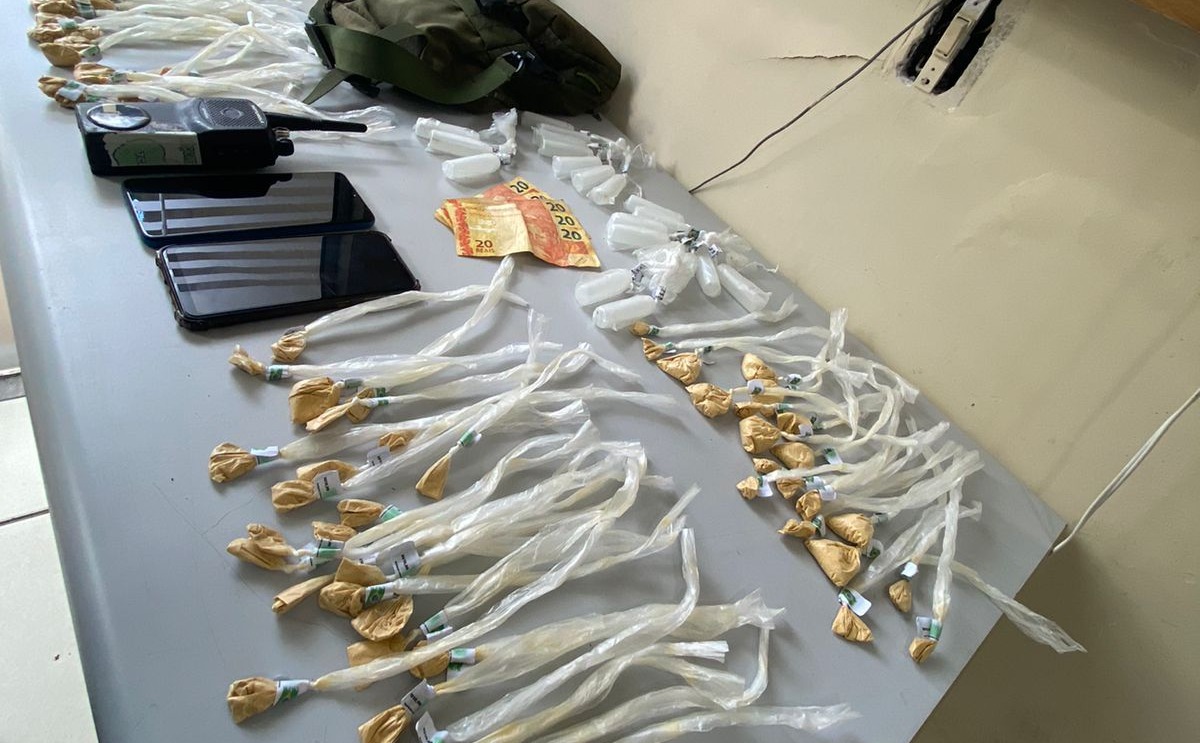 Chegando, os agentes localizaram a dupla em atitude suspeita e com uma mochila verde. Com eles, foram apreendidos 79 sacolés de cocaína, 20 frascos de cheirinho de loló, uma trouxinha de maconha, além de rádio de comunicação, dois celulares e R$ 100.