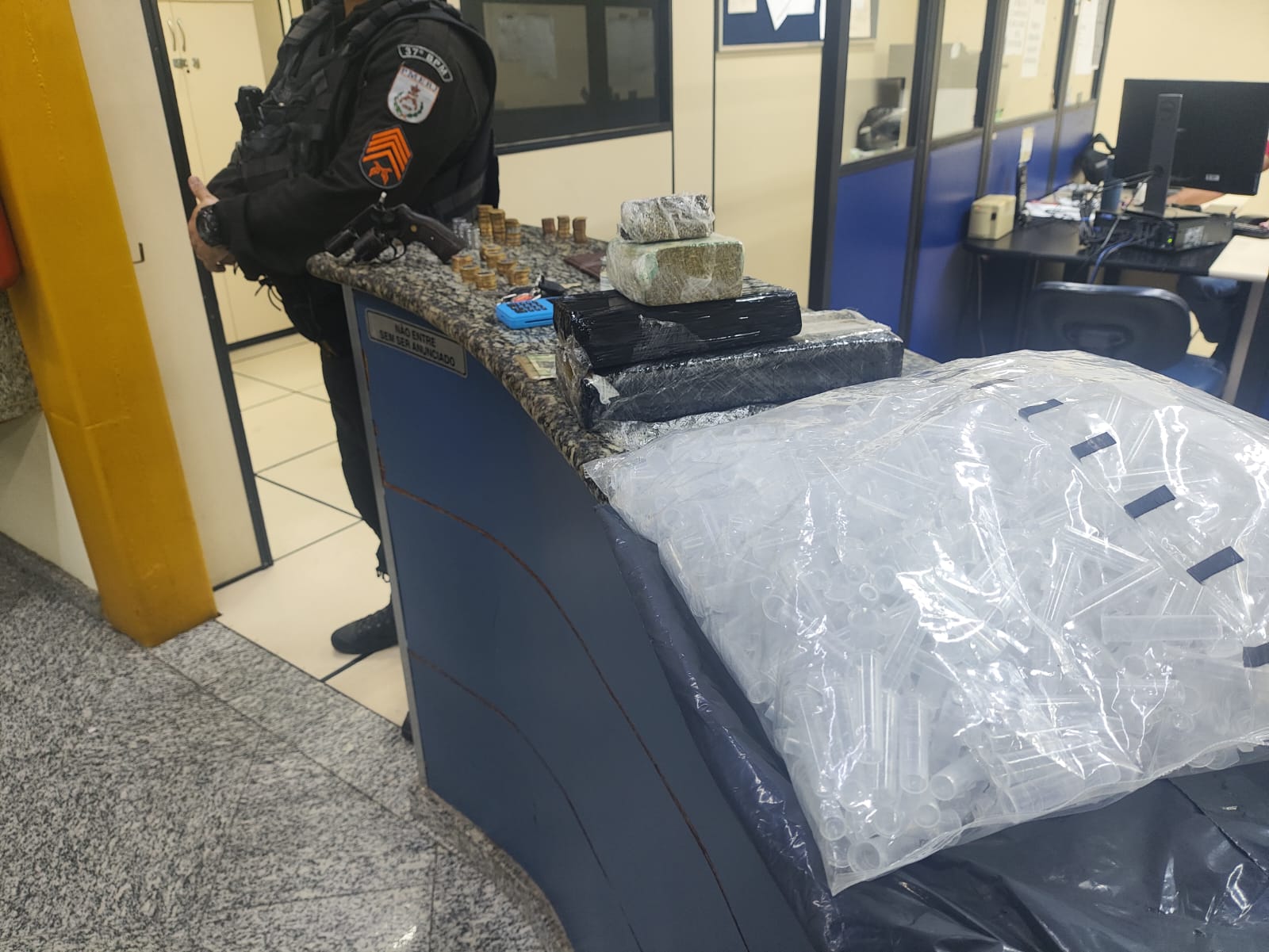 Os materiais estavam com um homem de 27 anos. Ele estava num carro e tentou fugiu dos policiais e acabou batendo num poste. Ele seria suspeito de ser gerente do tráfico do bairro São José. Ele foi levado para o hospital antes de ser encaminhado para a delegacia.