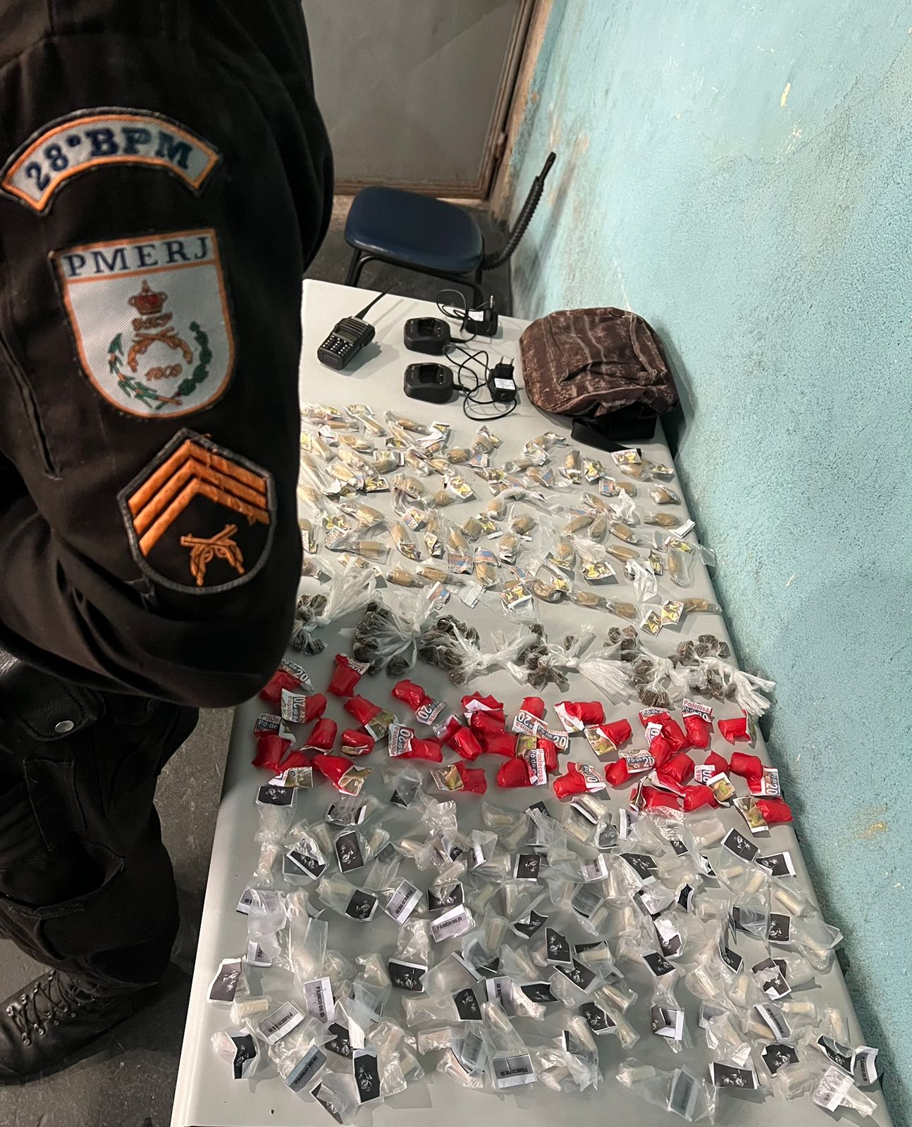 Na segunda, a Polícia Militar apreendeu 115 pinos de cocaína, 124 pedaços de maconha, um rádio transmissor e duas bases para rádio. O material estava numa mochila.