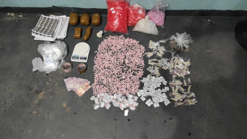 Em revista e busca na localidade, os agentes encontraram 939 pinos de cocaína, cinco bolas da mesma droga (quatro quilo), 78 pedras de crack, 33 trouxinhas de maconha, uma balança de precisão, R$ 55 e etiquetas, fitas adesivas, sacolés e pinos vazios.