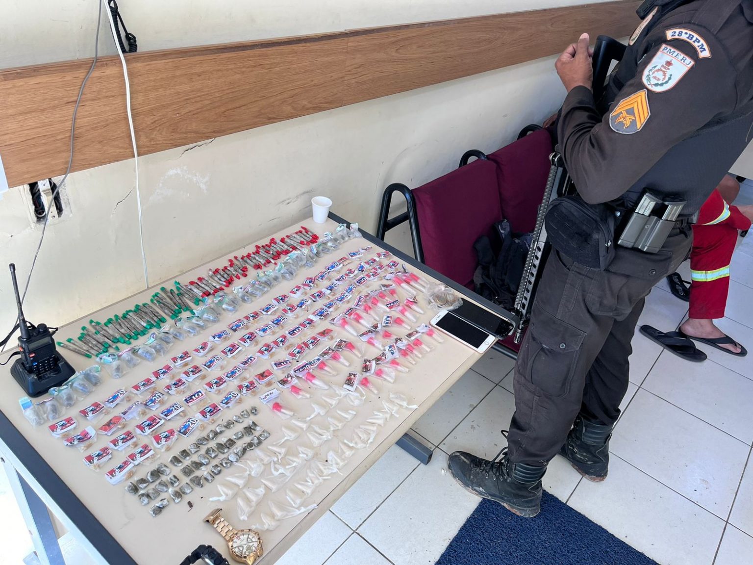 Chegando, os agentes se depararam com os suspeitos num escadão, onde foi realizado um cerco. Eles tentaram escapar, mas não conseguiram. Com eles, foram apreendidas 100 trouxinhas de maconha, 72 pedras de crack, 53 pinos de cocaína e 35 unidades de skunk, além de dois celulares e um rádio.