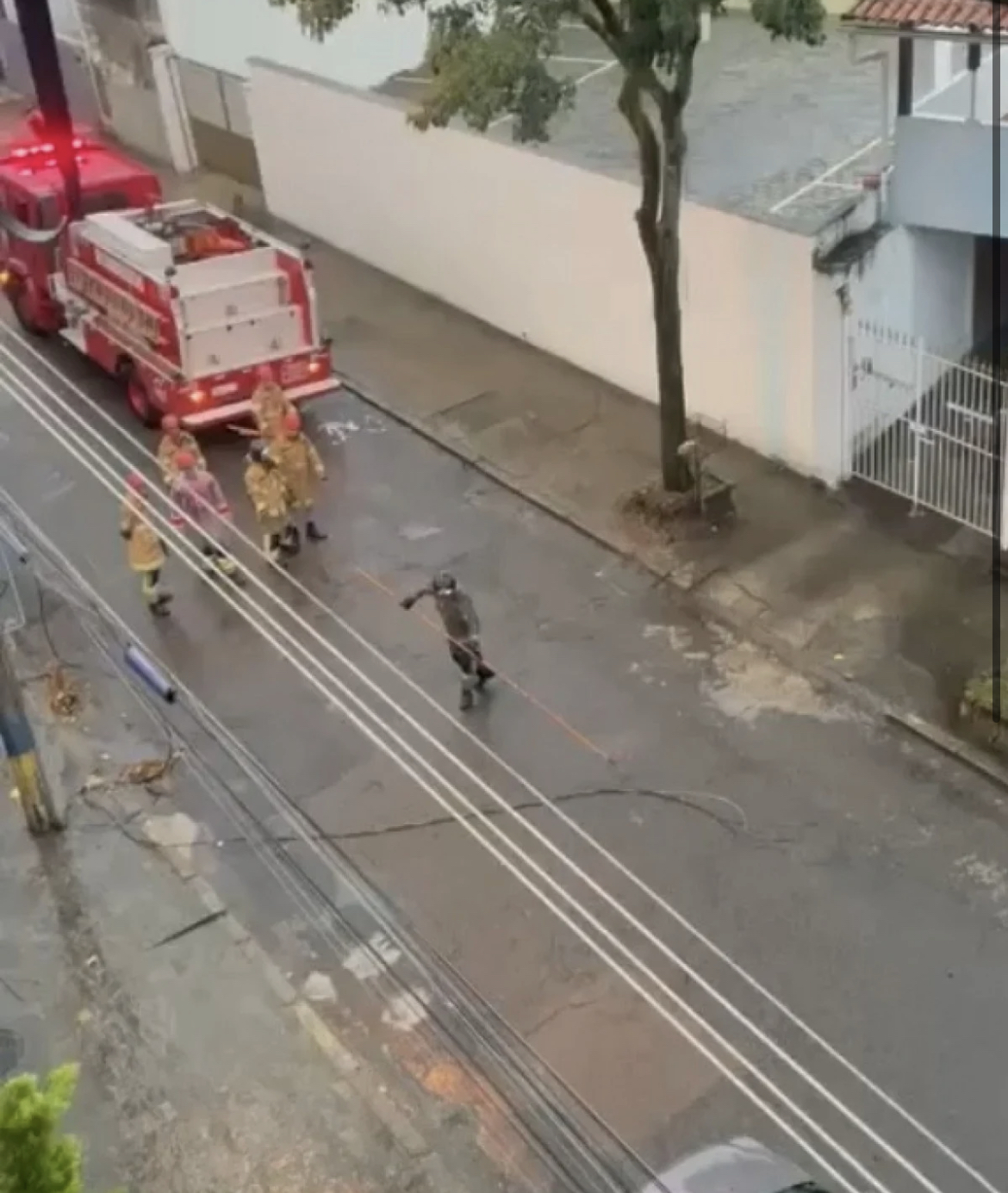 Após socorrerem a vítima, os bombeiros recolheram para a calçada, o fio que estava no meio da rua, e isolaram a área do poste com fitas de sinalização. Também foi realizada a poda da árvore que quebrou.