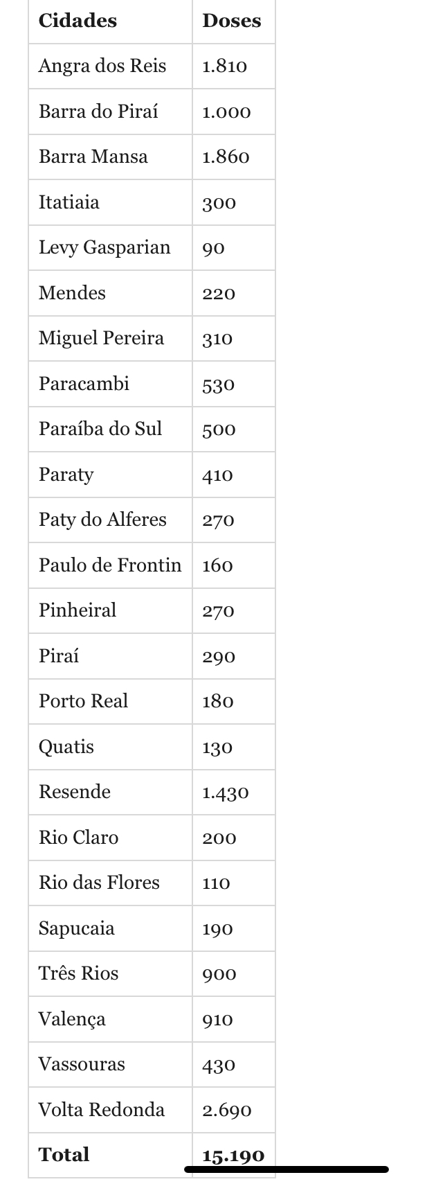 As cidades do Sul Fluminense vão receber nesta segunda-feira (25) um total de 15.190 doses da vacina de Oxford/AstraZeneca. A quantidade é destinada para primeira fase de imunização contra a Covid-19, determinada pelo Ministério da Saúde.