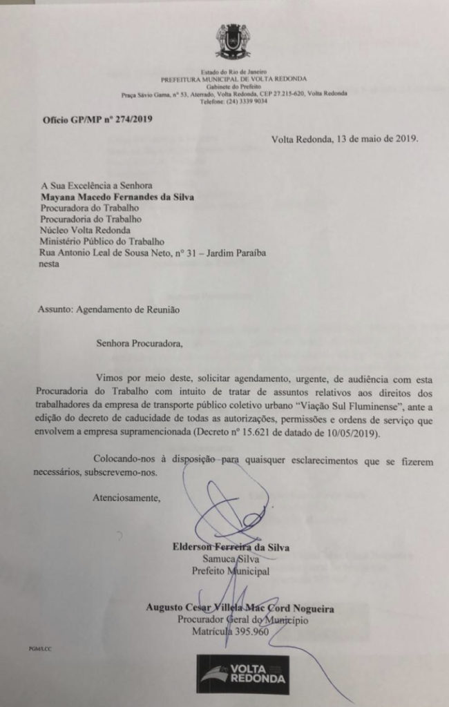 Com objetivo de garantir os direitos trabalhistas dos funcionários da viação Sul Fluminense, o prefeito de Volta Redonda, Samuca Silva, solicitou através de ofício uma reunião com procuradores do Ministério Público do Trabalho. O motivo: o decreto de caducidade da concessão e permissões de linhas da empresa, que detém a maioria das linhas de ônibus da cidade.