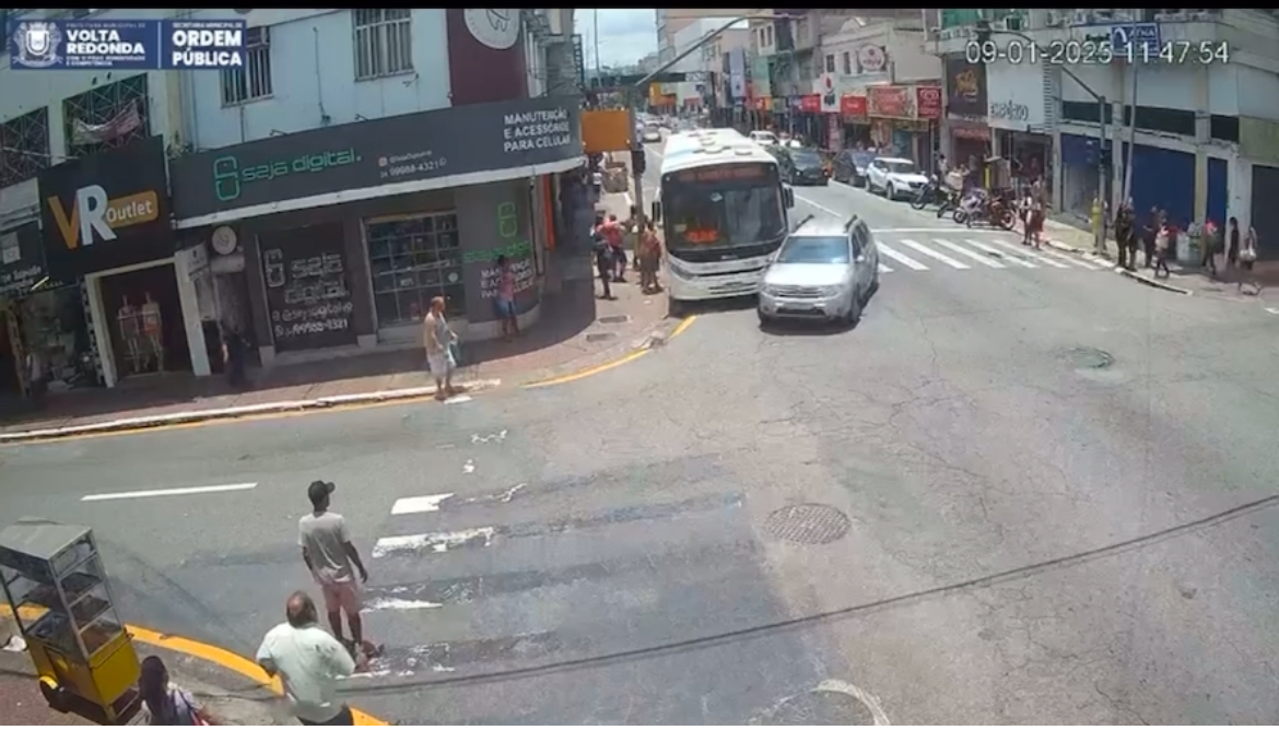 As imagens são de uma câmera da Semop (Secretaria Municipal de Ordem Pública) de Volta Redonda. Pelo vídeo, o veículo de passeio tenta cortar o ônibus para acessar a rua, gerando o impacto. Ninguém ficou ferido.