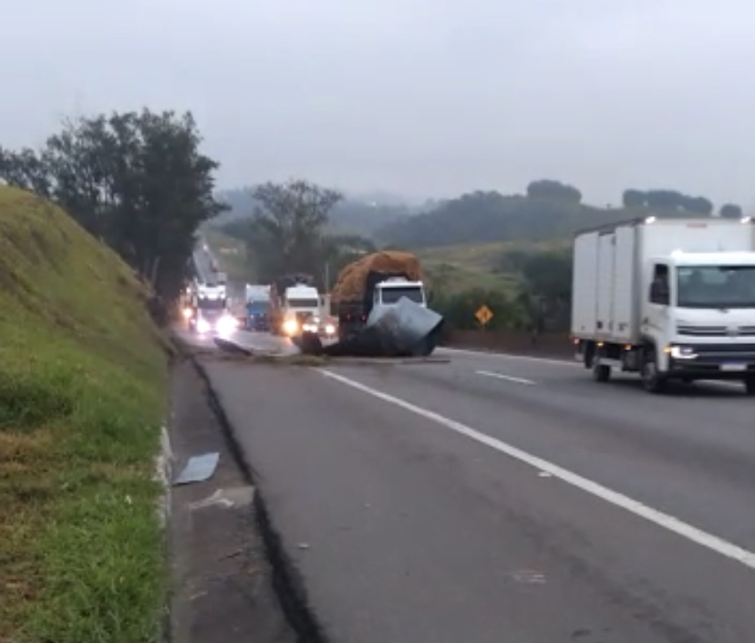 Uma bobina de aço desprendeu de uma carreta na manhã desta quinta-feira (9) na Via Dutra, na altura do Moinho de Vento, na pista sentido Rio, em Barra Mansa.