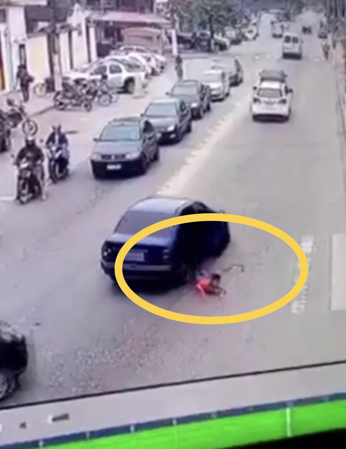 Logo atrás, vinha outros veículos que diminuíram a velocidade e desviaram da criança. O menino, por sua vez, levantou rapidamente e aparentemente não teve ferimentos graves.