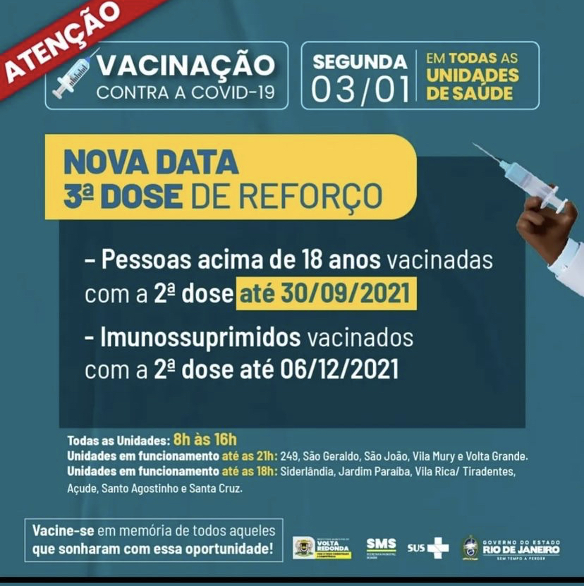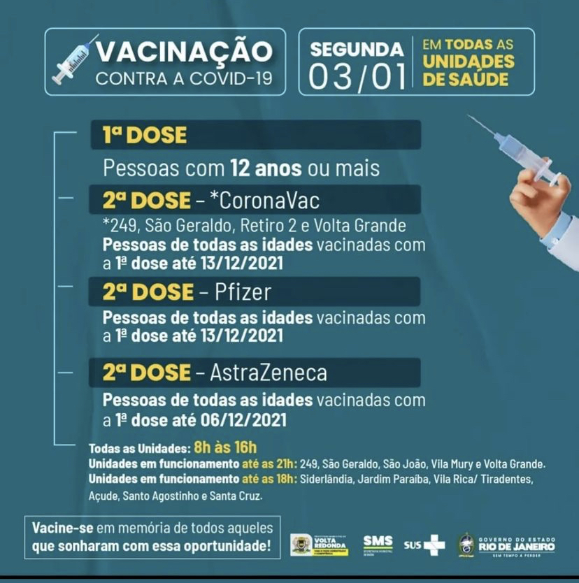 A prefeitura de Volta Redonda divulgou na noite deste domingo (2) o calendário de vacinação nesta semana. Confira nos quadros abaixo: