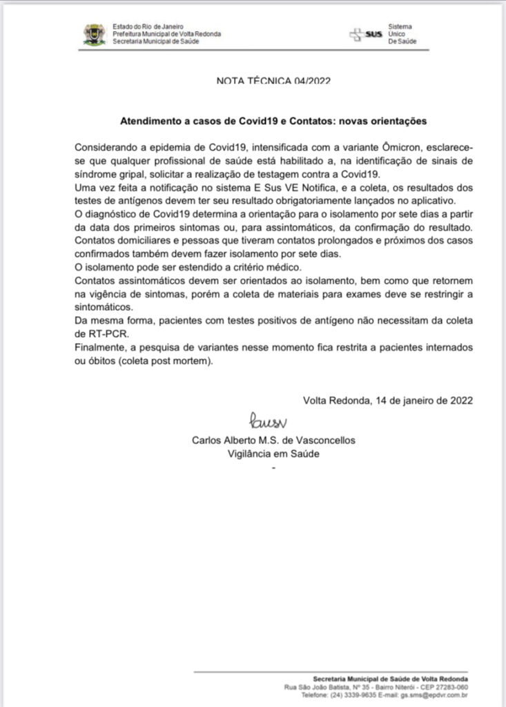 Volta Redonda, através da Secretaria Municipal de Saúde, emitiu nota técnica com novas orientações sobre a testagem e isolamento de pacientes com suspeita de Covid-19.